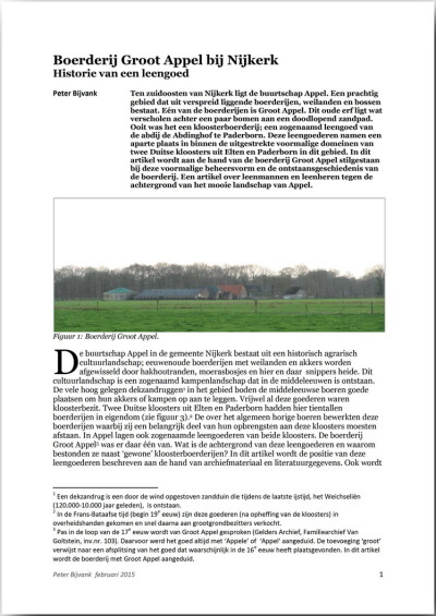 Ten zuidoosten van Nijkerk ligt de buurtschap Appel. Een prachtig gebied dat uit verspreid liggende boerderijen, weilanden en bossen bestaat. Eén van de boerderijen is Groot Appel. Dit oude erf ligt wat verscholen achter een paar bomen aan een doodlopend zandpad. Ooit was het een kloosterboerderij; een zogenaamd leengoed van de abdij de Abdinghof te Paderborn. Deze leengoederen namen een aparte plaats in binnen de uitgestrekte voormalige domeinen van twee Duitse kloosters uit Elten en Paderborn in dit gebied. In dit artikel wordt aan de hand van de boerderij Groot Appel stilgestaan bij deze voormalige beheersvorm en de ontstaansgeschiedenis van de boerderij. Een artikel over leenmannen en leenheren tegen de achtergrond van het mooie landschap van Appel.