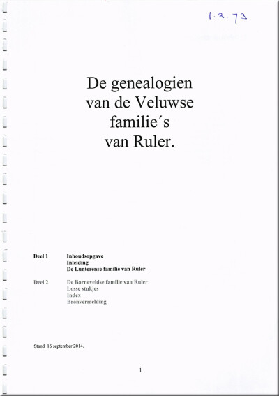 Kors Cornelis van Ruler als auteur, vergastte ons op de door hem aan ons toegestuurde genealogieen van de Lunterense en Barneveldse families Van Ruler. De achternaam Van Ruler is ontleend aan de gelijknamige boerderij Ruler, Ruyler of Reuler/Rueler in Barneveld, buurtschap Esveld. De Lunterense familie woonde hierop van 1736 tot 1766 en de Barneveldse van 1802 tot aan 1807. De boerderijnaam behoort tot de zogenaamde laar-namen, waar het het voorvoegsel Ru- vandaan komt is niet bekend. Misschien van 'ruw/ruig' als aanduiding van de stand van de grond? (Vgl. Rouveen). De Lunterense familie begint in 1655 met de patroniem Jan Hermsen, getrouwd met Jantje Maassen van de boerderij Surksum te Barneveld. Zijn zoon werd als van Ruijler aangeduid. Vermoedelijk is dit de eerste generatie. De schrijver behandelt het verloop van deze familie op een gedegen en duidelijk manier. Kaartjes en foto's ontbreken in dit overzicht, doch een uitgebreide index in deel 2, waarin ook der Barneveldse familie wordt behandeld, vergemakkelijkt het zoeken aanzienlijk.