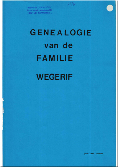 De oudste generaties vinden we in Twente, in het belastingcohier van 1602 is er sprake van Winolt Wegereef, nakomelingen in de volgende generaties komen voor in de buurt van Goor en Delden. Nakomelingen worden ook Stoevelaar en ten Duis genoemd door verhuizing naar genoemde boerderijen. Drie broers, Hendrik van 1757, Jan van 1771 en Derk van 1776 komen naar Apeldoorn, in Apeldoorn verandert de naam Wegereef in Wegerif, waarbij Hendrik alleen mannelijke nakomelingen heeft. Vanaf dit punt wordt de genealogie gesplitst in diverse takken, te weten Hermannus wordt tak A VII, Willem Jan wordt tak B+C VII en Gerrit wordt tak D VII. Dit is gedaan vanwege de omvang van de genealogie. Later is de familie verspreid over geheel Nederland, maar ook het buitenland, echter het grootste gedeelte woont nog steeds in Apeldoorn. Het geheel is zeer toegankelijk door een goede index van 13 blz., het werk zelf telt 56 blz., gefotokopieerde uitgave, formaat A4. Onze dank aan de inzender.
