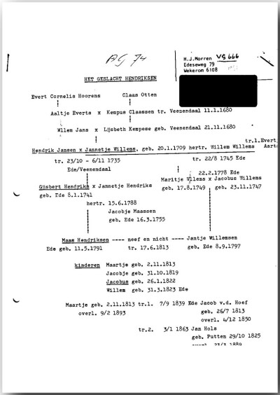 De stamvader van het geslacht Hendriksen is Hendrik Jansen, die ca. 1709 geboren zal zijn. Hij tr. Jannetje Willemse, geb. (waar ?) 20- 1-1709. Jannetje is d.v. Willem Jans en Lijsbeth Kempus, zij is d.v. Kempus Claassen (z.v. Claas Otten) en Aaltje Everts (d.v. Evert Cornelis Hoorens). Een kleinzoon van Hendrik Jansen zal de geslachtsnaam Hendriksen hebben aangenomen. De laatste bladzijde geeft enkele gegevens betreffende een familie Van Beek. Beide stambomen noden uit om uitgebouwd en 'aangekleed' te worden. Dank voor het geschenkexemplaar. ACZ.