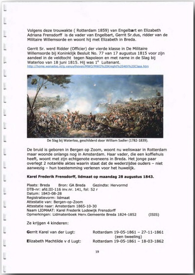 De kwartierstaat van Gerrit van der Lugt, door schrijver Hedde van der Lugt ism ons lid Gert Kuijt, lopend van 1779 tot 1864. Gerrit Jansen, geboren te Harderwijk op 01-04-1779 is militair. Hij neemt deel aan diverse veldtochten onder Daendels en vecht in de slag bij Waterloo. Een leuke kwartierstaat met mooie foto's en copieen van actes.