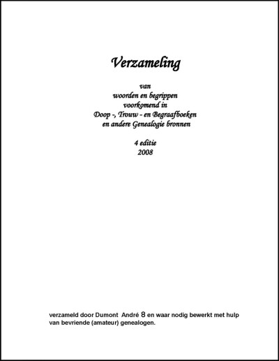 André Dumont: "In deze 4e uitgave zijn weer meer trefwoorden en begrippen toegevoegd. Totaal zijn er circa 20.000 trefwoorden met hun betekenis opgenomen. Niet alleen Genealogie trefwoorden maar ook woorden uit gerechtelijke akten, schepenakten, rechtbankverslagen etc. Ook nu zijn alle woorden gewoon overgenomen die ik vond, inclusief schrijf- en typefouten etc. Soms heb ik ook het oorspronkelijke woord opgenomen in de verklaring. Ook staat er vaak een ? bij een woord. Ondanks vele hulpbronnen, hulp van medegenealogen o.a van de Genealogiegroep Seniorweb (die ik vaak als laatste redding inschakelde) is het dan niet gelukt een passende verklaring ergens te vinden. Ook nu weer heb ik bewust geen bronvermelding opgenomen. U kunt er van uitgaan dat alles wat op het internet te vinden is, in oude woordenboeken en mijn persoonlijk archief is opgenomen."