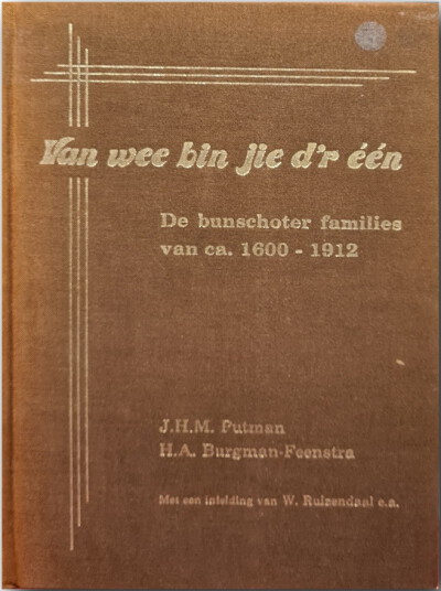 Herdenkingsboek onder auspicieen van de Stichting Bunschoten 600 jaar Stad. Uitgangspunt voor opneming in het genealogisch overzicht is het gewoond hebben in Bunschoten voor 1913. Personen, die blijkens de inschrijving in het bevolkingsregister, slechts kort in Bunschoten verbleven, zijn in het algemeen niet opgenomen. Wel zijn opgenomen degenen die hier zijn geboren, gehuwd of overleden. Van 1812-1817 was de gemeente vergroot met het grondgebied van de vroegere ambachtsheerlijkheid Duist, de Haar en Zevenhuizen. De personen die in die periode voorkwamen in de akten van de burgerlijke stand uit dat gebied, en hun gezinnen, zijn eveneens in de genealogisch overzicht opgenomen.