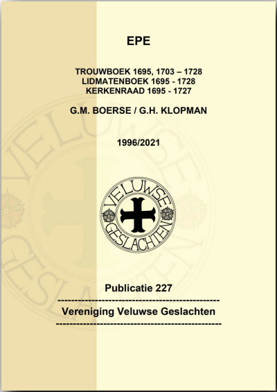 Voor u ligt een bewerking van het trouwboek van de Nederduits-Gereformeerde gemeente van Epe (1695, 1701-1728). Het oorspronkelijke trouwboek maakt deel uit van een groter geheel, dat bij het Gelders Archief bekend staat onder RBS-nummer 662.3. De bewerking van het Trouwboek is door G.M. Boerse in 1996 als transcriptie opgenomen in de lijst van publicaties van de Vereniging Veluwse Geslachten. In 2021 is de bewerking van G.M. Boerse op fouten gecontroleerd door G.H. Klopman en waar nodig zijn verbeteringen aangebracht. Daarnaast is nu ook een transcriptie gemaakt van het lidmatenboek van Epe (1695-1728) wat onderdeel uitmaakt van hetzelfde RBS-nummer. Tenslotte is een overzicht gemaakt van alle ouderlingen en diakenen van Epe in de periode 1695 – 1728. Deze is ook toegevoegd aan deze publicatie.