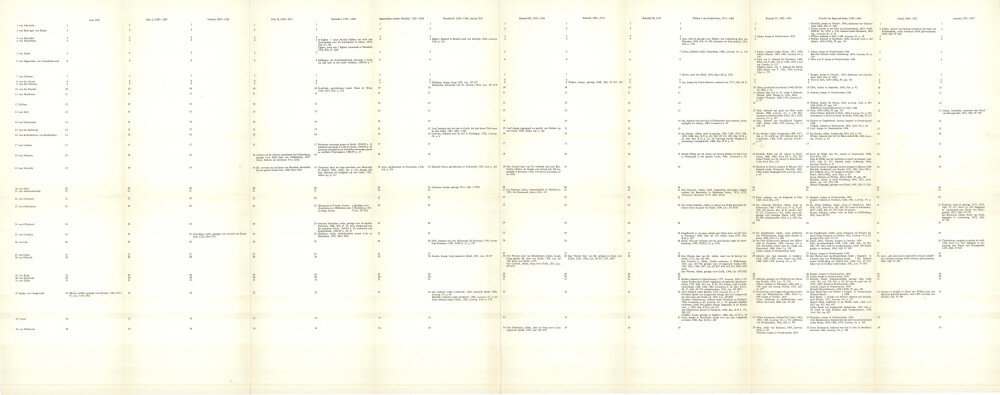 In een tiental tabellen (waarvan er hierboven een wordt getoond) wordt per familienaam aangegeven wanneer (onder welke heer/graaf van Gelre) en in welke bron vermeldingen te vinden zijn van leden van die betreffende familie. Deze 10 tabellen betreffen: