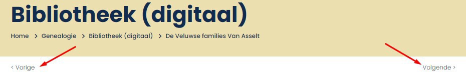 Als u via een van de Genealogiepagina's naar een specifiek boek, tijdschrift, publicatie of scan bent gegaan, kunt u vervolgens via de knoppen Vorige en Volgende doorklikken naar een vorig of volgend document. U hoeft daarvoor dus niet eerst weer terug te gaan naar de overzichtspagina.